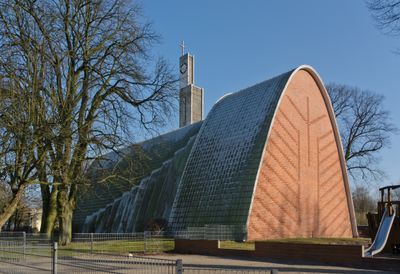 Die Erlöserkirche weist zwei ineinandergreifende Betonschalen mit Aluminiumverkleidung auf, deren parabolische Querschnitte Fensterschlitze bilden.