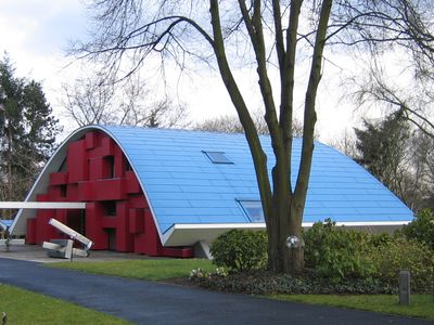 Das Gebäude befindet sich in einem ruhigen Wohnviertel und ist am besten vom Gehweg aus sichtbar. Die Fassade zur Strasse bietet die beste Ansicht auf die charakteristische rote Kubenform.
