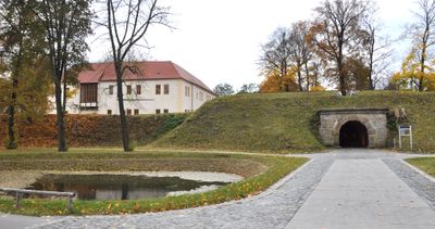 Die Festung zeigt eine beherrschende Steinstruktur mit Erdwällen, Pulverturm, Kommandantenhaus und unterirdischen Gängen durch das Gelände.