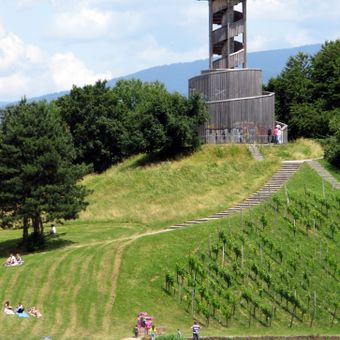 Von den Aussichtsplattformen sieht man den Kaiserstuhl und die Vogesen, während Kinder den Hügel zum Schlittenfahren nutzen.