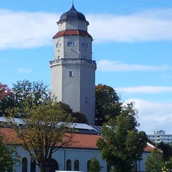 Wasserturm Freising, Städtischer Wasserturm, hoher oktogonaler Eisenbetonbau mit Haubendach und Umgang, in neubarocker Formensprache, von Ludwig Lang, 1906; Pumpenhaus, kleiner tempelartiger Bau mit Satteldach, von Alois Steinecker, 1890/91.