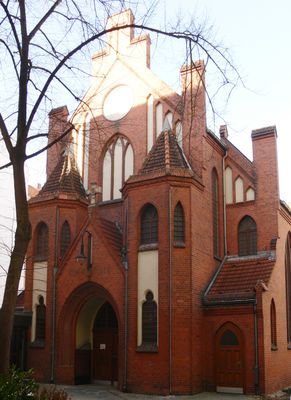 Die Friedenskirche steht als Ziegelbau mit architektonischen Elementen, die deutsche religiöse Gebäude aus ihrer Entstehungszeit kennzeichnen.