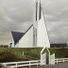 Das Bauwerk aus weißem Kalkstein zeigt drei dreieckige Giebel und einen turmähnlichen Chor, der einem großen Segel ähnelt.