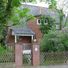 Das Einfamilienhaus zeigt einen Klinkerbau mit steilem Satteldach, runder Auslucht und geschnitzten Holzpfeilern in der Eingangshalle.