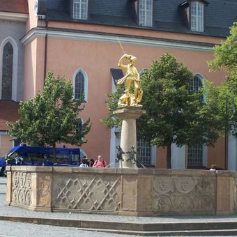 Georgsbrunnen, Mittelalterlicher Brunnen am Marktplatz, Eisenach, Deutschland