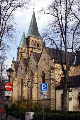 Die spätgotische Hallenkirche zeigt eine monumentale neugotische Weststruktur mit Sandsteinquadern und dreiteiligen Maßwerkfenstern im vierjochigen Aufbau.