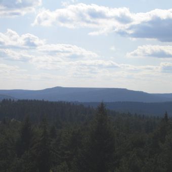 Der Gipfel beherbergt das obere Becken des Pumpspeicherwerks Goldisthal, umgeben von natürlichem Waldbestand.