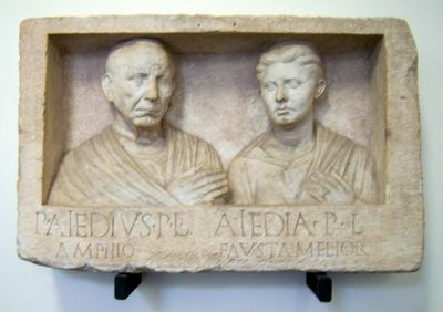 Das Relief zeigt Ehesymbolik durch verschränkte Hände und Aiedias zwei Ringe, während es Altersmerkmale gemäß römischer Porträttradition erfasst.