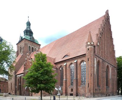 Die Marienkirche zeigt die Backsteingotik mit ihren hohen Mauern, Spitzbögen und detaillierten Backsteinmustern in der gesamten Struktur.