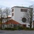 Die Heilig-Kreuz-Kirche zeigt moderne architektonische Elemente mit klaren Linien, geometrischen Formen und großen Fenstern zur natürlichen Beleuchtung der Innenräume.