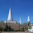 Sechs sichtbare Kegeldächer markieren verschiedene Bereiche der Kirche, wobei ein großer Kegelturm natürliches Licht in den Altarraum lässt.