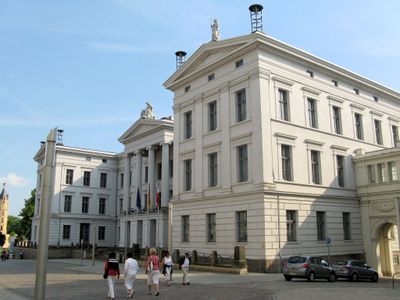 Die Staatskanzlei Mecklenburg-Vorpommern zeigt eine dreiflügelige Anlage mit terrassiertem Ehrenhof, erbaut im klassizistischen Stil mit Sandsteinsäulen.