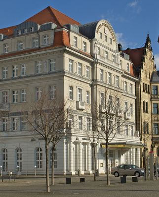 Hotel Fürstenhof ist ein historisches Gebäude mit einer Granit-Fassade und klassischen architektonischen Elementen aus dem frühen 20. Jahrhundert, gelegen im Zentrum von Leipzig. Das Bauwerk verbindet Wohnraum mit kulturellen Funktionen und zeigt die repräsentative Bauweise dieser Epoche.