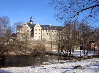 Schloss Pfaffroda steht in Steinbauweise auf 540 Metern Höhe im Erzgebirgskreis und zeigt traditionelle deutsche Architekturelemente.