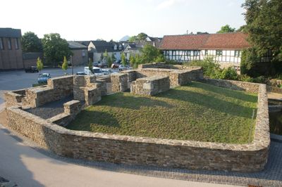 Die verbliebenen Fundamente der Unteren Burg ragen etwa einen Meter hoch auf, neben der Sankt Maria Magdalena Kirche im Zentrum von Rheinbreitbach.