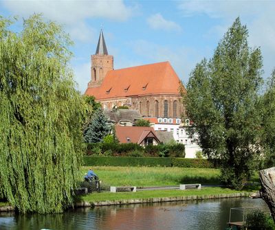 Die Marienkirche steht als religiöses Bauwerk aus roten Ziegeln mit Spitzbögen und Strebepfeilern in der Architektur Brandenburgs.