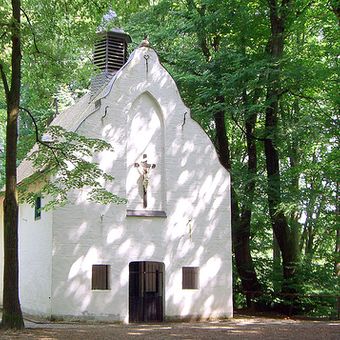 Die Irmgardiskapelle befindet sich in einem Waldgebiet der Süchtelner Höhen, mit steinernen Wegpredigtstühlen entlang des Erdwegs.