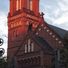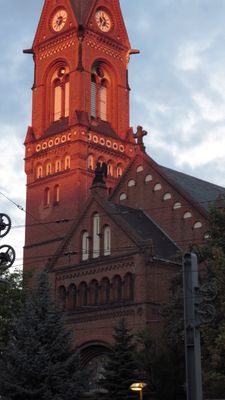 Die Immanuelkirche aus rotem Backstein weist Rundbögen, massive Mauern und symmetrische Türme nach neuromanischen Architekturprinzipien auf.