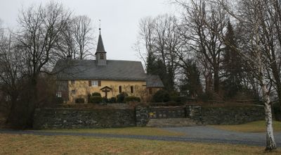Die Kapelle steht auf dem Klausenberg mit dicken Steinmauern und Rundbogenfenstern im romanischen Baustil.