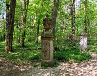 Irrhain ist ein Park mit einem barocken Steinbogen und schattigen Waldwegen, auf denen Gedenksteine für Schriftsteller und Dichter verteilt sind. Das Gelände erstreckt sich über eine bewaldete Fläche mit alten Eichen und zeigt die Spuren einer langen Nutzungsgeschichte als literarischer Ort.
