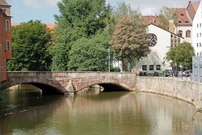 Die Karlsbrücke ist ein Steinbogenbrücke über die Pegnitz, die Nürnberg mit einer Reihe hoher Pfeiler und Bögen durchspannt. Die Konstruktion aus behauenen Steinen zeigt mehrere symmetrische Gewölbe, die das Wasser unterhalb stützen.