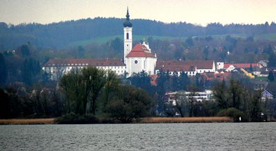 Das Kloster liegt erhöht über dem Ammersee, wobei der Glockenturm als Orientierungspunkt für Boote auf dem See dient.