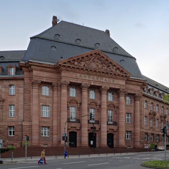 Das Landeshaus zeigt einen neobarocken Stil mit kolossalen Säulen durch alle Etagen und einem Mansarddach aus rotem Sandstein aus dem Main-Becken.