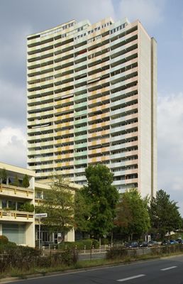 Langer Johann ist ein Wohngebaeude mit 27 Geschossen und eine Hoehe von 80 Metern in Erlangen. Die Struktur besteht aus zwei Wohnbloecken, die einen zentralen Aufzugskern umgeben, und enthaelt insgesamt 384 Wohnungen mit Loggien oder Terrassen sowie 16 Ladenflaechen in angrenzenden niedrigeren Gebaeudetraekten.
