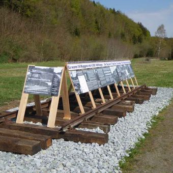 Das Mahnmal KZ-Transport 1945 zeigt Inschriften und Gedenkelemente am Ort, wo ein Gefangenentransport 1945 für fünf Tage hielt.