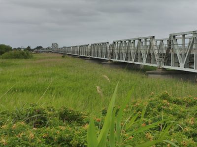 Die aktuelle Behelfsbrücke aus dem Jahr 2012 ist 200 Meter lang und ermöglicht Fahrzeugen, Fußgängern und Radfahrern die Überquerung der Wasserstraße.