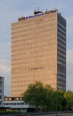 Der Postbank-Turm erhebt sich 91.59 Meter mit 19 Stockwerken und zeigt eine Vorhangfassade aus Glas und Leichtmetall nahe dem Essener Hauptbahnhof.