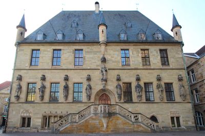 Das spätgotische Rathaus verfügt über ein hohes Walmdach, sechs Türme und detaillierte Sandsteinschnitzereien mit Kaisern und biblischen Szenen.