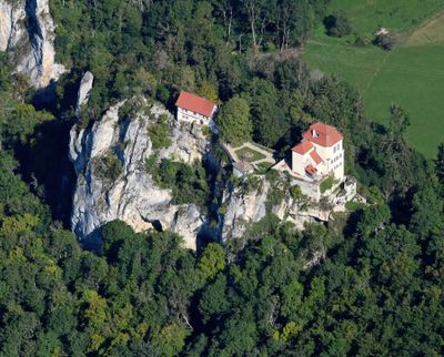 Die Burganlage steht auf einem steilen Felsen über der Donau, mit einem quadratischen Wohnturm und einem zweistöckigen Jägerhaus.