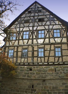 Das Steinschloss erhebt sich über die Landschaft von Ebelsbach und zeigt verschiedene architektonische Elemente deutscher Bauepochen.