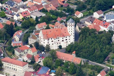 Schloss Grumbach ist eine Schlossanlage in Rimpar, die mit Steinmauern, Türmen und mehreren Geschossen in rechteckiger Anordnung gebaut wurde. Die Struktur zeigt typische Merkmale der bayerischen Bauweise mit fest verankerten Mauern und funktionalen Räumen für Wohnen und Verteidigung.