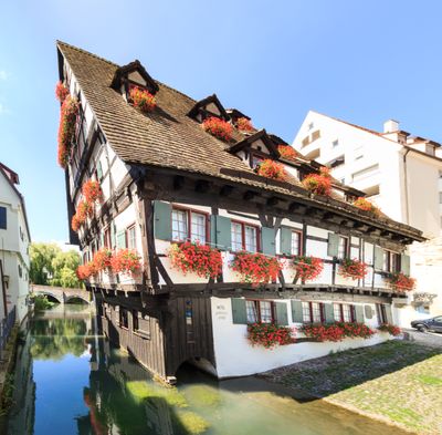 Das Schiefe Haus steht am Ufer der Blau mit einer Neigung von 9 bis 10 Grad von der vertikalen Position.