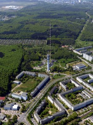 Der Schweriner Fernsehturm erhebt sich 136 Meter in die Höhe, mit einem dreieckigen Querschnitt, abgerundeten Seiten und Betonkonstruktion.