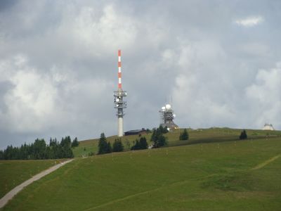 Der Sender Feldberg besteht aus zwei Funktürmen unterschiedlicher Baualter auf einem Berg in der Schwarzwald-Region. Der neuere Turm ist etwa 82 Meter hoch, der ältere aus Beton rund 75 Meter, und beide stehen auf einer Höhe von etwa 1.481 Metern.