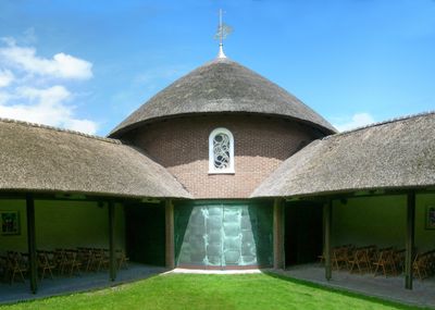 Die Kirchenstruktur umfasst einen kreisförmigen Winterbereich und einen Sommerbereich im Freien mit Reetdächern, verbunden durch ein dreieckiges Atrium.