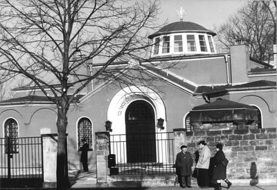 Das 1866 als Totenhalle auf dem Neuen Jüdischen Friedhof errichtete Gebäude wurde im Zweiten Weltkrieg beschädigt und zwischen 1949 und 1950 wieder aufgebaut.