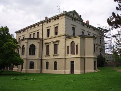 Die Villa Merkel steht in einem Landschaftsgarten nahe dem Neckar, mit Elementen der Neorenaissance und einem nach Norden ausgerichteten Eingang.