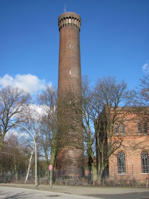 Der Wasserturm aus Backstein steht als Ingenieurbauwerk in Hamburg-Mitte und zeigt charakteristische architektonische Elemente seiner industriellen Funktion.