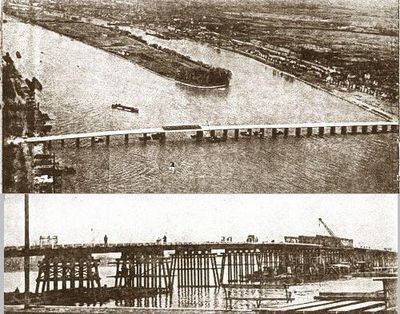 Die Alexander-M.-Patch-Brücke erstreckte sich 610 Meter über den Rhein mit 27 Stahlstützen und einer Holzbalkenkonstruktion.
