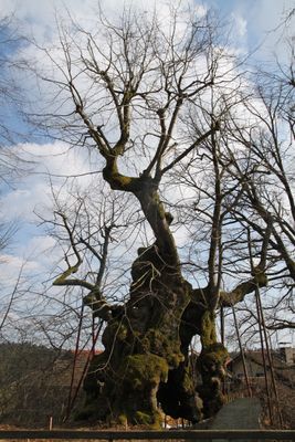 Diese Linde ist etwa 800 Jahre alt und erlitt 1950 erhebliche Schäden, als Stürme ihre Hauptkrone stark beschädigten.