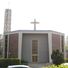 Das Kirchengebäude zeigt klare Linien und geometrische Formen mit großen Fenstern, die tagsüber natürliches Licht in den Innenraum fallen lassen.