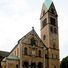 Die St. Familia Kirche zeigt neuromanische Architektur mit Rundbögen, massiven Mauern und steinernen Verzierungen in ihrer Außen- und Innengestaltung.