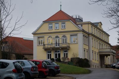 Schloss Kreßbach zeigt eine dreistöckige Struktur mit verzierten Portalen und einer neobarocken Erweiterung an der Südseite des Gebäudes.