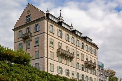 Schloss Kirchberg erhebt sich über die Bodenseeregion mit Türmen, dekorativen Fassaden und traditionellen Architekturelementen aus dem 19. Jahrhundert.