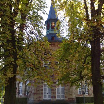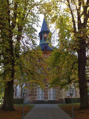 Die Evangelische Kirche zeigt klassizistische Elemente mit symmetrischen Proportionen, Säulen und einer ausgewogenen Fassade, die Schinkels architektonische Prinzipien kennzeichnet.
