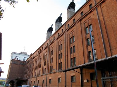 Die Malzfabrik verfügt über vier metallene Dörrhauben in Form von Ritterhelmen, rote Backsteingebäude und erstreckt sich über 27.500 Quadratmeter.